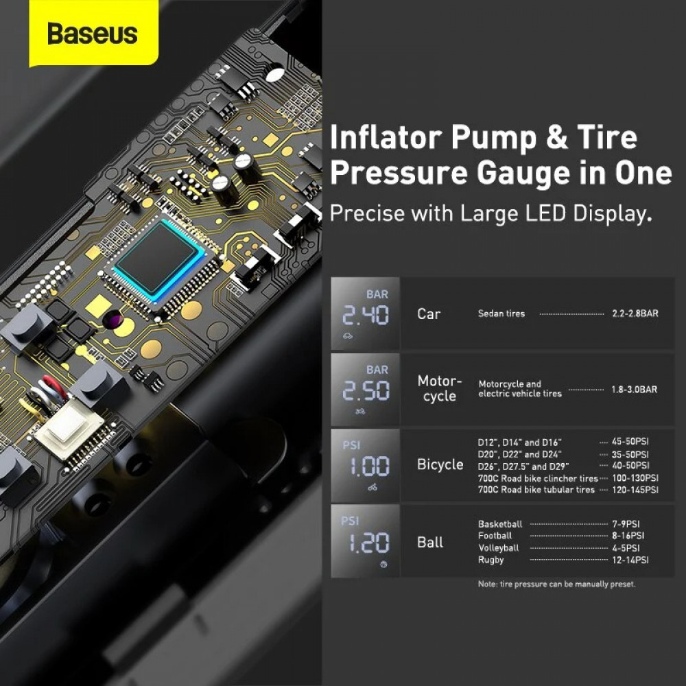 يضخ المحرك في الدقيقة ما يصل إلى ثلاثين لترًا من الهواء في الدقيقة ، لذلك يمكن لهذه المضخة إعادة نفخ الإطارات الأربعة في أقل من نصف ساعة. بناءً على ذلك ، فإن عناصر التحكم البديهية والشاشة المدمجة تجعل استخدام Baseus Super Mini أمرًا سهلاً.